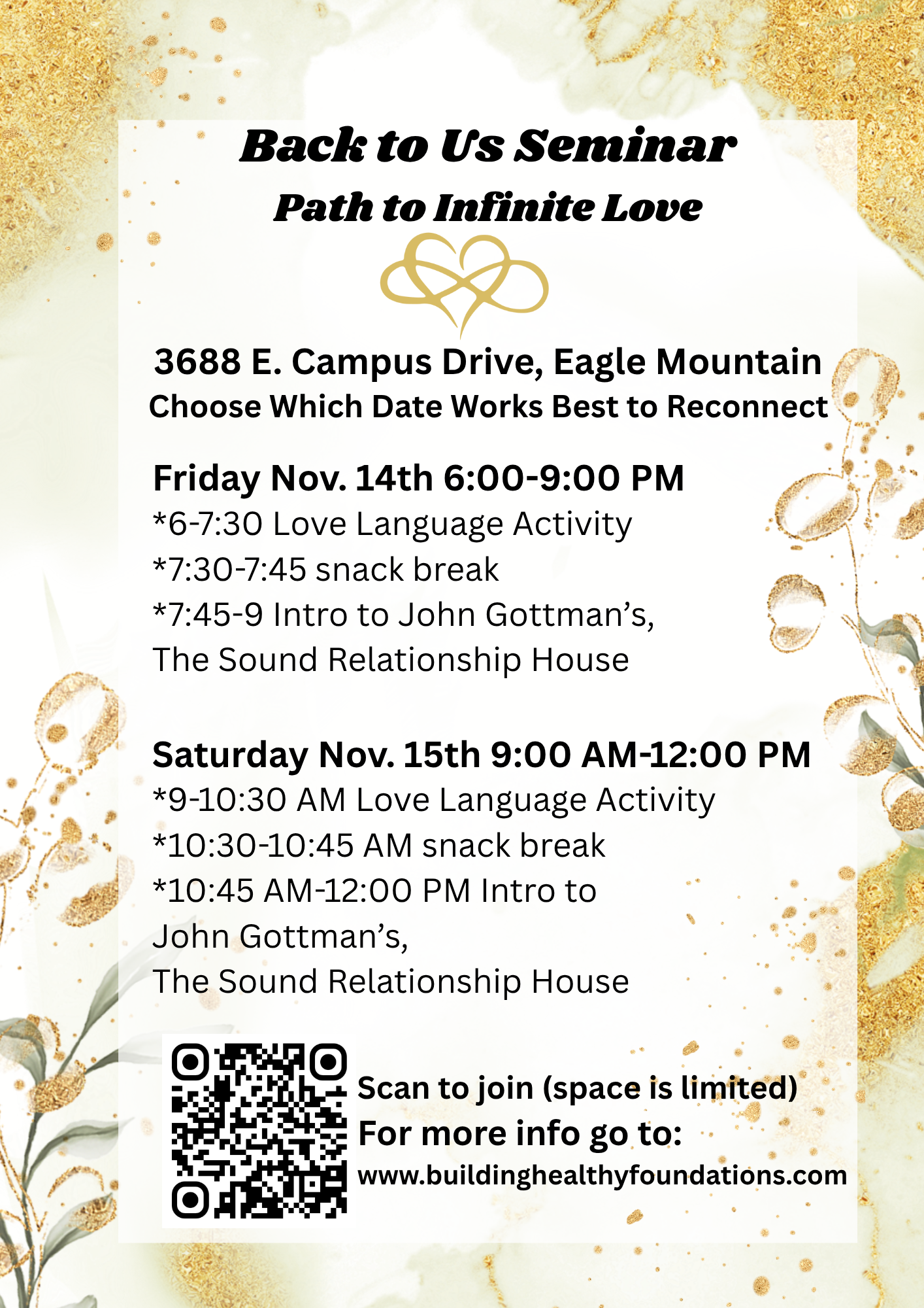 Whether you've been together for decades or are just beginning your journey as a couple, this seminar is designed to deepen your connection, strengthen your communication, and help you understand each other in more meaningful ways. Relationships thrive not just on love, but on intentional effort, shared understanding, and emotional safety—and that’s exactly what we’ll explore today.